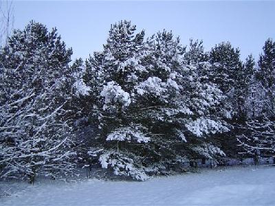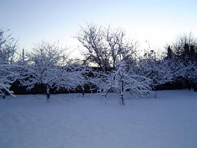 early morning shot after a heavy fall of snow, the apple trees 'laden with