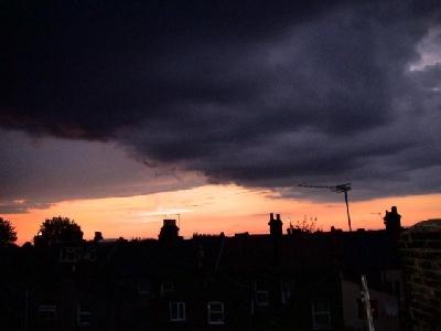 at 21:40 hrs, after a fall of rain, a shower is beginning to die out at sunset