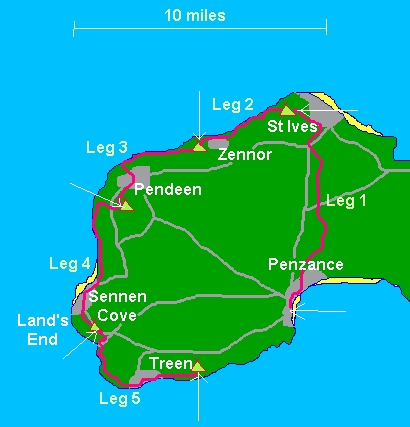 This report follows our route around the coast, with each individual leg representing individual days between campsites. Please click on each leg on the map below, to view photographs taken along the route. Also, St Ives, and Zennor have their own page - just click on the town to view.