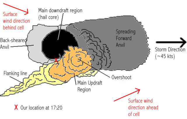 Firstly, as displayed earlier, one would expect to see the following when viewing the storm from the east. Although the forward anvil was spreading far in advance of the storm, much of the precipitation falling from the anvil was fairly light. Therefore, one would expect to see a long way into the storm, almost towards the main core, as follows: