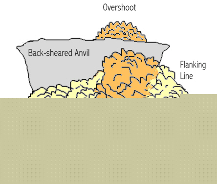 Secondly, if viewing the storm from the rear, one would expect to see a well-developed back-sheared anvil, and a flanking line on the right-hand-side of the storm rising into a main updraft and over-shooting top at the top of the storm. Provided the observer's distance from the cell isn't too great, the main hail and precipitation downdraft would be seen towards the left-hand-side of the storm, as follows: