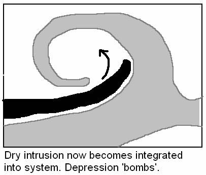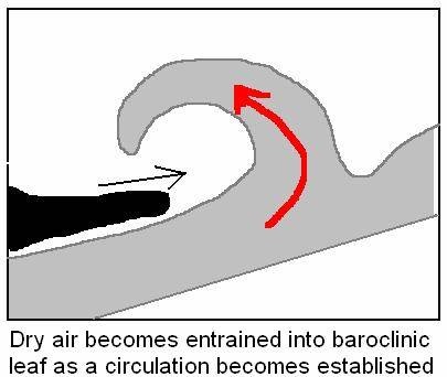 In fact, this baroclinic leaf is already well-developed, and is starting to wrap around in a cyclonic manner. This very dry slot of air now becomes ingested into the cloud head, effectively sucked eastwards into the base of the baroclinic leaf. Imagine the dry slot travelling eastwards towards the base of the leaf, along the northern edge of the main trailing front. This very dry air is now termed a dry-intrusion. This diagram below shows how the dry intrusion interacts with the developing cloud-head, and how it is entrained into the system: