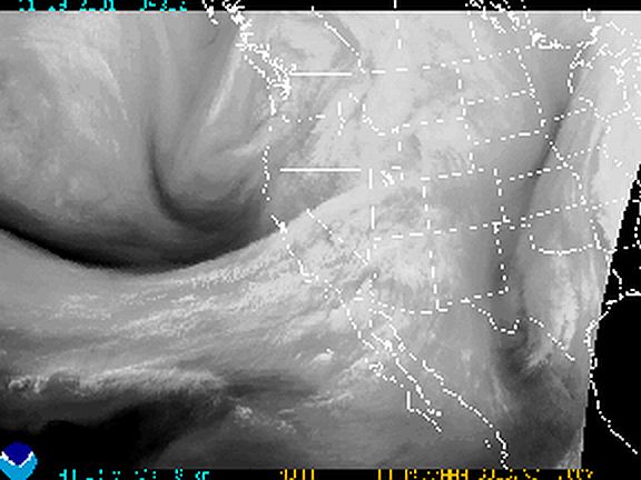 Lets start by explaining what WV imagery actually shows. Rather than directly sensing where clouds are sitting, WV sensors actually pick up moisture levels in the atmosphere, and convert it into a useable image. Obviously, the greatest amounts of moisture are where clouds have formed, so clouds are technically visible on the images. This first image below, shows a number of good characteristics (but ignore the labels on the image :