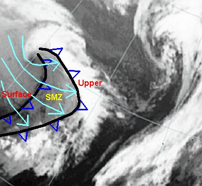 On the above image, the cold blast of mid and upper level air has sheared the upper front, and pushed it well ahead of the surface cold front. The SMZ is the moist, shallow layer of air at the surface, between the two fronts.