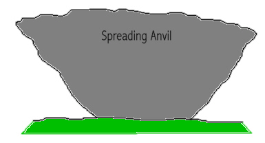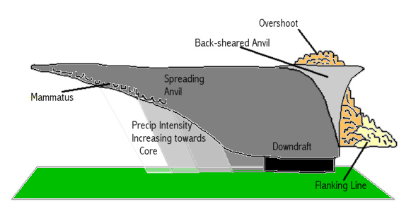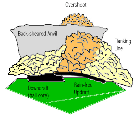 Secondly, if viewing the storm from the rear, one would expect to see a well-developed back-sheared anvil, and a flanking line on the right-hand-side of the storm rising into a main updraft and over-shooting top at the top of the storm. Provided the observer's distance from the cell isn't too great, the main hail and precipitation downdraft would be seen towards the left-hand-side of the storm, as follows: