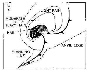 At face value, the similarities are remarkable. The flanking line feeding into the main updraft region was orientated almost exaclty as the conceptual model states, both the forward and back-sheared anvils are correct, and the heaviest precipitation downdraft is located correctly in relation to the rest of the storm. South to south-westerly winds at the surface ahead of the updraft are supported by the conceptual model, as are west to north-westerly winds behind the cell. But what about the precipitation set-up?