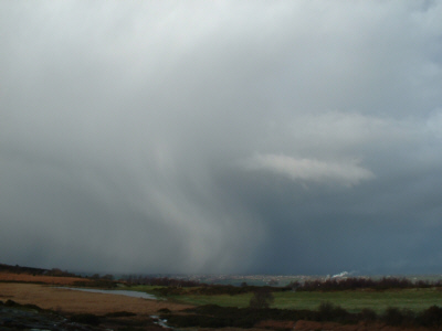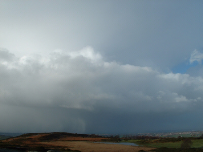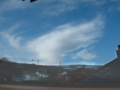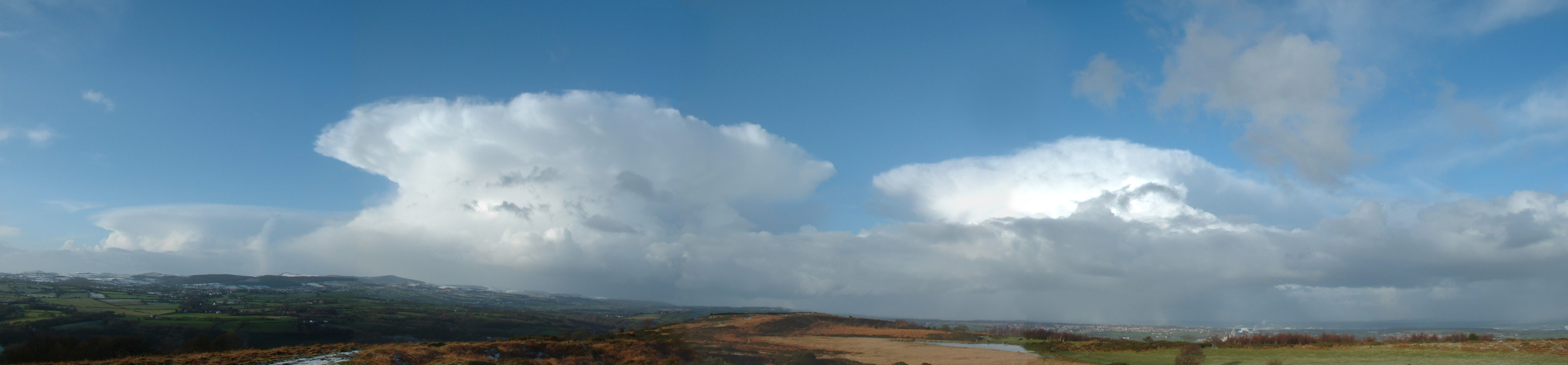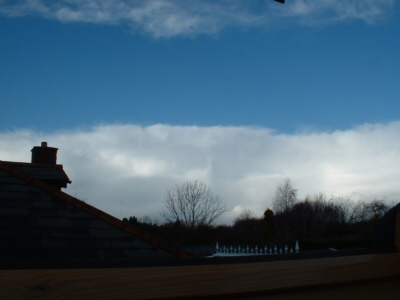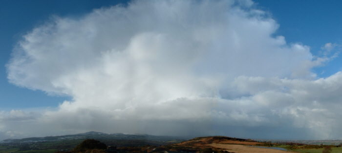 I peered northwards from my window at 11am to see a mass of cumulonimbus clouds. These were actually the front edge of a trough drifting southwards through the Irish Sea. As they neared, they began towering over the village of Hope, threatening a white-out.